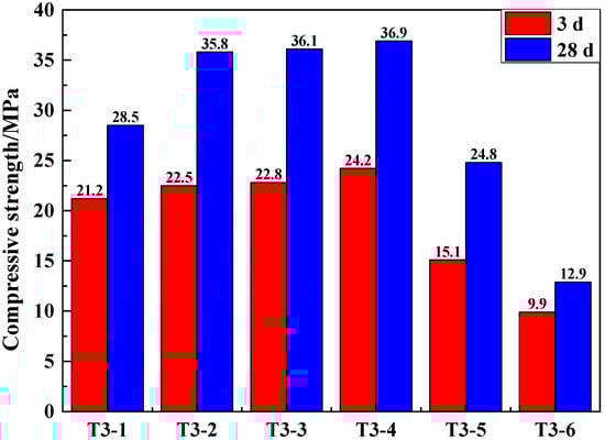 The SSCND was premixed with cement for 30 s before water was added to guarantee molding. The slurry was stirred and cured for 3 and 28 days to obtain the experimental samples. The compressive strength of the samples tested is shown in Figure 2.