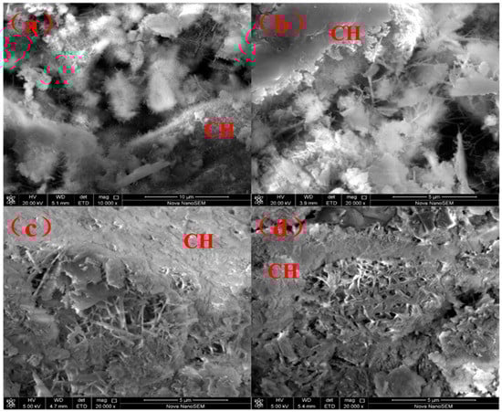 It can be seen in Figure 5b–d, the fine grains consisting of gel C-S-H were disorderly. In the massive calcium hydroxide (CH) crystals, and the hydration products in GCM in the SSCND–cement were similar to the cement gelled materials. The needle-shaped AFt crystals and flocculation C-S-H gel overlap each other to form space net structure, and populate the hardening of the phase surface, hole, crack, the unreacted dihydrate gypsum, and smelting slag particles knot together to form an integrated part, thus improving the strength of the GCM [41,42].