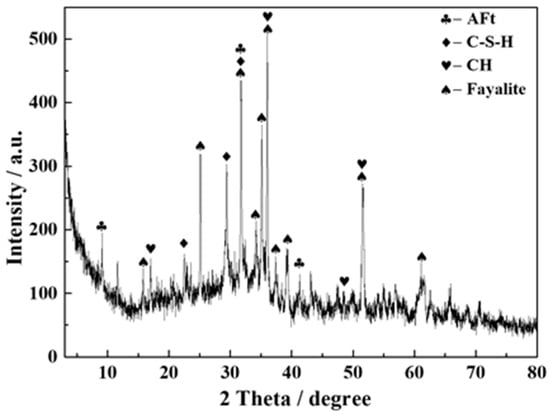The XRD diffraction pattern of sample T4-2 after being cured for 28 days showed the production of calcium silicate hydrate (C-S-H), Aft, and fayalite (Figure 6), consistent with the SEM observations.