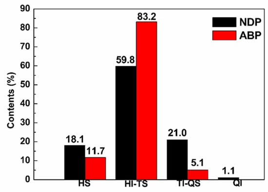 Solubility parameter (n-hexane soluble (HS), n-hexane insoluble and toluene soluble (HI-TS), toluene insoluble and quinoline soluble (TI-QS), and quinoline insoluble (QI)) of the NDP and the ABP.