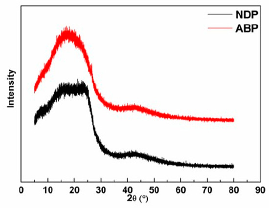 Figure 4 shows the XRD graphs of the NDP and the ABP. Both of them showed broad peaks between 10° and 30°. Peaks between 10° and 20° were attributable to asphaltene components, while those between 20° and 30° were attributable to stacked molecular structures [26]. Therefore, the stacked structure was more evident in the NDP than that in the ABP due to larger condensed aromatic molecules in the NDP, as shown in Figure 1. In contrast, the oxygen in the ABP impeded ordered stack of molecules. Nevertheless, more symmetrical peak of ABP may indicate more uniform composition, which is consistent with the extraordinarily uniform components presented in Figure 1.