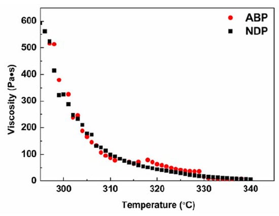 The viscosity–temperature curves of NDP and ABP are shown in Figure 5. The viscosity of both the NDP and the ABP decreased sharply with increasing temperature when the temperature was lower than 310 °C, then decreased gradually to about 330 °C, while the viscosity–temperature curves became almost flat above 330 °C because of the temperature sensitive property of the pitch. It can be seen that the viscosity–temperature curve of the ABP showed two jumping steps between 310 °C and 330 °C, which suggested that the ABP had worse spinning performance than the NDP. However, both of them had excellent spinning performance when the NDP and the ABP were spun into PFs by the melt-spinning method at 335 °C. Therefore, the results indicated that the spinnability of the ABP had not deteriorated even though it had more oxygen, which is usually considered as an impurity atom. This may be attributed to the homogenous components of the ABP, as previously mentioned.
