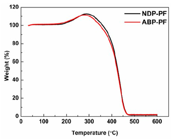 Thermogravimetric (TG) curves of NDP-PF and ABP-PF during stabilization process in air atmosphere.