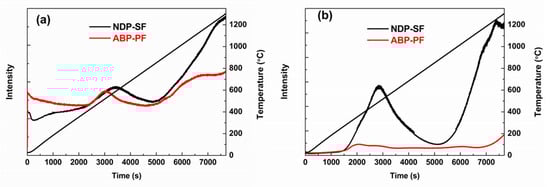 After 1200 °C carbonization, both NDP-CF and ABP-CF had high yield over 70%, which is favorable for producing low-cost, general-purpose CFs. Higher oxygen content of ABP-CF compared to NDP-CF, as shown in Table 3, denoted that less oxygen of ABP-CF was given off during the carbonization process in view of the similar oxygen content of NDP-SF and ABP-SF. Less gas was released in the carbonization process of ABP-SF (35.7%) compared to the NDP-SF (37.7%), which might be beneficial for the mechanical properties of CFs because fewer defects would be generated. This also illustrates that the oxygen existing in the pitch precursor was more stable than that introduced in the stabilization process. This could be verified by the TG–MS results of the CO and CO2 given off from oxygen-containing groups of fibers during carbonization process for NDP-SF and ABP-PF, as shown in Figure 7a,b. Both CO and CO2 were released at two stages; the first peak was located at 400–800 °C and 270–850 °C, respectively. Then, the amount of release began to increase rapidly for both CO and CO2, especially for NDP-SF. It should be noted that the difference in the release amount of CO2 for NDP-SF and ABP-PF was more distinct. The NDP-SF revealed higher peak intensity and magnitude of CO2 in both stages, especially the high temperature stage, compared to ABP-PF. This showed that the removal of oxygen was more arduous below 1200 °C when the oxygen was from the pitch precursor introduced by air blowing than the oxygen from the stabilization process. Therefore, moderate amounts of oxygen in the pitch precursor could improve the stabilization and carbonization properties of PFs.
