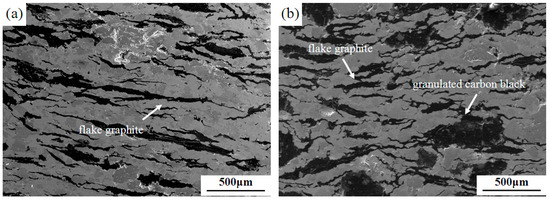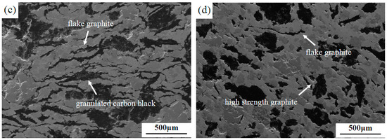 Figure 1 shows the microstructures of materials with different lubricating phase in the direction parallel to the pressure direction. The elongated strips in Figure 1a–d are natural flake graphite, the wide strips in Figure 1b,c are granulated carbon black, and the approximate spherical shape in Figure 1d is high-strength graphite. When the mass fraction of granulated carbon black is 0 wt%, that is, all the flake graphite is added (Figure 1a). The flake graphite tends to be compressed into a flat strip shape and join with each other. In the case of granulated carbon black as the lubricating phase (Figure 1b,c), the granulated carbon black is deformed to form strip structures in this direction. In the samples with high-strength graphite as the lubricating phase (Figure 1d), the high-strength graphite no-strip morphology was observed. In the pressing pressure, the natural flake graphite produced a slip, and granulated carbon black were suppressed into deformation. High-strength graphite is artificial graphite; it has a certain strength to avoid significant deformation under pressure. Therefore, the morphology shown in Figure 1 is exhibited.