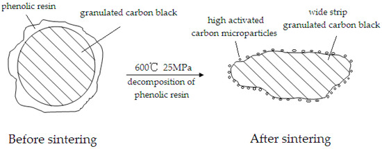 The wetting property between the components of the material has a great influence on its microstructure and properties, and some scholars have conducted in-depth research on it. B.B. Straumal et al. [28] observed for the first time that other WC/WC grain boundaries are not partially wetted and are therefore “dry”. They are pseudopartially wetted, namely they have a high contact angle with cobalt binder, and nevertheless contain a 2–3 nm thin uniform Co-rich layer. In the majority of cases, the direct transition occurs from partial into complete wetting [29,30,31]. The sequence of discontinuous partial wetting to pseudopartial wetting and continuous pseudopartial wetting to complete wetting transitions wear observed in other articles [32,33,34,35]. A.B. Straumal et al. [36] considered the phenomenon of apparently complete GB wetting by a liquid phase. However, the wetting phase can also be solid [37] or even amorphous [38,39]. The wet ability between copper and graphite is poor, usually modified on the surface of graphite to improve wettability [13,40,41]. In the preparation of the lubricating phase, the surface of the carbon black is coated with a phenolic resin, and then subjected to high temperature and high-pressure treatment (600 °C, 25 MPa), and the carbon black is changed from a granular shape to a wide-strip shape. The decomposition of the phenolic resin in situ produces carbon particles of extremely small particle size. The carbon microparticles have extremely high activity and are easily diffused to the interstitial site of the Cu–Fe alloy, thereby increasing the interfacial bonding force between the lubricating phase and the metal matrix, which is equivalent to the wetting effect. The lubricating phase structure change diagram is shown in Figure 2. Therefore, it is necessary to further discuss the interface between the lubricating phase and the metal matrix.