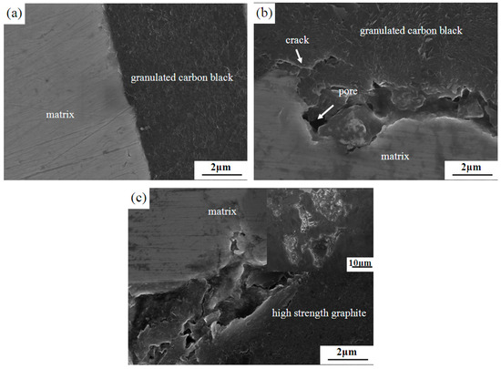 - The mass fraction of granulated carbon black was 5 wt%, and it was easy to form a good interface with the matrix, but the interface was prone to pores and cracks when its mass fraction was 10 wt%. The interface between the high-strength graphite and matrix was also poor.