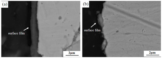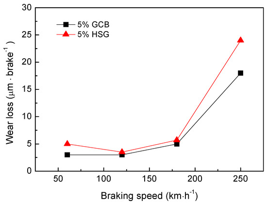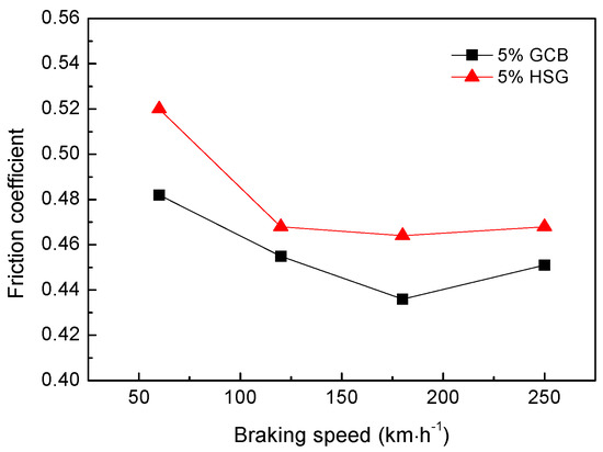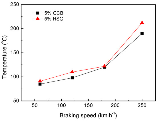 Figure 8 shows the effect of different lubricating phases on the friction coefficient of materials under the same mass fraction (5 wt%). The friction coefficient of 5% GCB is lower than that of 5% HSG. With the increase of the braking speed, the friction coefficient of the composites decreased, the friction coefficient reached the minimum value at 180 km·h−1, and then increased slightly at 250 km·h−1 instead. The coefficient of friction of the materials is between 0.43 and 0.52. The friction coefficient of the material is related to the braking condition and the friction surface morphology. The surface film of the sample 5% GCB is better bonded to the matrix (described in Section 3.3), which is easier to maintain relatively stable in friction, while the smooth continuous friction surface film reduces the coefficient of friction of the material. The 5% HSG formed a rough surface and a discontinuous surface film after friction (Figure 5c), resulting in a higher coefficient of friction of the material. As the braking speed increases, the friction power increases causing the sample surface temperature to rise. Because the thermal expansion coefficient of the surface film is different from that of the matrix, the surface film is prone to crack and break under the effect of thermal stress, so the rough surface is formed during the friction process, which increases the friction coefficient of the material. The curves of the worn surface temperature of the materials with different lubricating phases vary with the braking speed as shown in Figure 9. When the braking speed is lower than 180 km·h−1, the surface temperature of the material is not high enough to make the friction surface film and the matrix thermal mismatch; the friction surface film can be stable for a period of time, so that the friction coefficient of the material is reduced. When the braking speed is higher than 180 km·h−1, the surface temperature of the material rises sharply, and the surface film is easily destroyed by the thermal stress, resulting in a slight increase of friction coefficient at 250 km·h−1. This is consistent with the results in Figure 6.