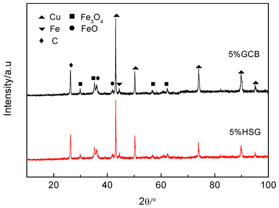 Figure 6 shows the XRD patterns of worn surfaces with different lubricating phases. During the friction process, the oxidation wear occurred on the surface of both materials. The diffraction peaks of FeO and Fe3O4 appeared, and the diffraction peak intensity of the 5 wt% granulated carbon black as the lubricating phase sample was slightly higher. A large amount of heat is generated on the friction surface during the friction process. As the friction process progresses, the freshly worn surface reacts with oxygen in the atmosphere to form an oxide film on the surface. The friction coefficient of the material can be effectively reduced by the existence of the oxide film. The higher intensity of the diffraction peak of the sample with the granulated carbon black as the lubrication component may be related to the formation of a more complete friction surface film.