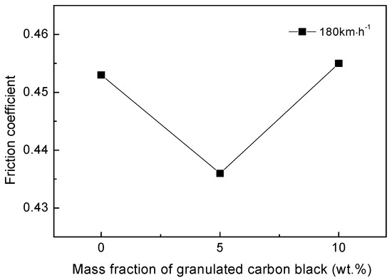 Effect of mass fraction of granulated carbon black on friction coefficient of materials.