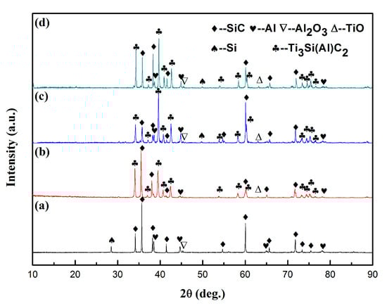 X-ray diffraction (XRD) patterns on the surface of the composites infiltrated by the Al–Si–xTi alloy (Si: 10 wt.%) with Ti contents (wt.%) of (a) 0, (b) 5, (c) 10, and (d) 15.