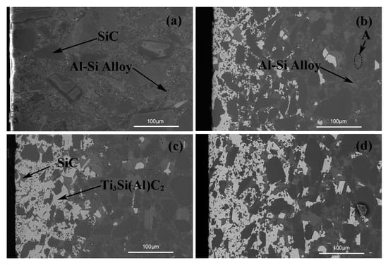 Figure 2 shows the cross-sectional backscattered electron (BSE) images of the composites infiltrated by the Al–Si–xTi alloy (Si: 10 wt.%; x = 0, 5, 10, and 15 wt.%). Table 2 lists the EDS analysis results of the different regions shown in Figure 2. As shown in Figure 2b–d, a distinct white reaction layer was formed on the surface of each composite infiltrated by the Al–Si–xTi alloy containing Ti. In contrast, there was no obvious reaction layer on the surface of the composite infiltrated by the Al–Si alloy (Si: 10 wt.%) (Figure 2a). Based on the EDS analysis results (listed in Table 2) and XRD patterns (shown in Figure 1), the white reaction layer is suggested to be Ti3Si(Al)C2 with a small amount of SiC. The dark phase indicates SiC, and the gray phases comprising elements slightly heavier than SiC are considered to be Al–Si with a small amount of C. Therefore, the point A (shown in Figure 2b) indicates the Al–Si phase. The white reaction layer containing Ti3Si(Al)C2 gets thicker as we move from Figure 2b–d. The maximum thickness of the relatively dense white reaction layer was approximately 110 µm in the composites infiltrated by the Al–Si (10 wt.%)–Ti (15 wt.%) alloy. The thickness of the less dense white reaction layers was approximately in the range of 0.3–0.4 mm. This shows that increasing the Ti content in the Al alloy significantly increased the relative content of Ti3Si(Al)C2 formed near the surface of the composites; this is consistent with the XRD results.