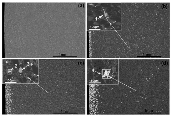 To further study the distribution of Ti, the cross-sections of the specimens after infiltration were analyzed in detail. Figure 3 shows the low-magnification cross-sectional BSE images of the reaction layers and inner regions of the composites infiltrated by the Al–Si–xTi alloy (Si: 10 wt.%). Table 3 lists the EDS analysis results of the different regions shown in Figure 3. Some light-white phases can be found in the inner regions of the composites containing Ti, as shown in Figure 3b–d. These light-white phases were scattered throughout the inner regions. Based on the EDS analysis of regions 1 and 3, the atomic ratio of Ti to Al was approximately 1:3. Therefore, the long strip phase in these regions is suggested to be TiAl3. The atomic ratio of Ti to Al in regions 2 and 4 was approximately 3:1. Therefore, the irregular, block-shaped white phase in these regions is suggested to be Ti3Al, which is another type of Ti–Al intermetallic compound. This shows that increasing the Ti content in the Al alloy promoted the formation of new Ti–Al intermetallic compounds. These compounds were scattered in the inner regions of the composites containing Ti. Based on the composition and Ti–Al binary phase diagram, we propose two possible reaction mechanisms for the formation of Ti3Al and TiAl3 through the direct reaction between Al and Ti in the melt (Equations (6) and (7)).
