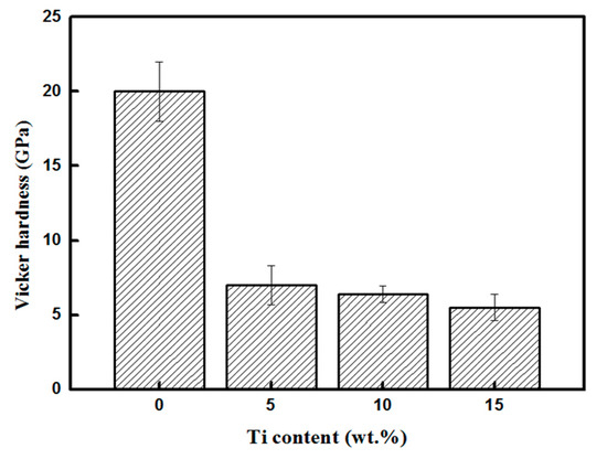 Figure 4 shows the results of the Vickers hardness test conducted on the composites infiltrated by the Al–Si–xTi alloy (Si: 10 wt.%). The hardness value of the composite infiltrated by the Al–Si alloy (Si: 10 wt.%) was approximately 20 GPa, which was significantly higher than that of the composites containing Ti. The Vickers hardness decreased with the increase in the Ti content. This is mainly because the composite infiltrated by the Al–Si alloy was largely composed of SiC, whereas the ones containing Ti exhibited Ti3Si(Al)C2 on the surface, the hardness of which is lower than that of SiC.