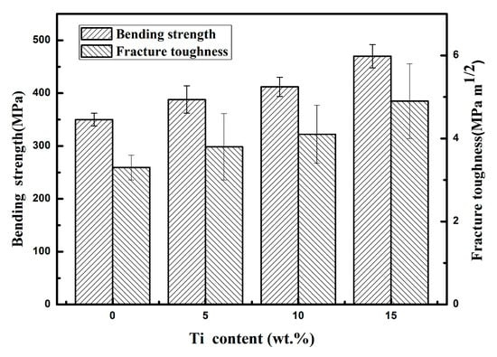 Bending strength and fracture toughness (determined using the single-edge notched beam (SENB) test) of the composites infiltrated by the Al–Si–xTi alloy (Si: 10 wt.%).