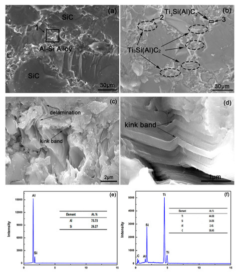 Figure 6c shows a higher-magnification image of region 2 shown in Figure 6b. Figure 6d is a higher-magnification of region 3 in Figure 6b. Slice shapes of Ti3Si(Al)C2 are obvious in regions 2 and 3, confirmed by the EDS analysis shown in Figure 6f. In the loading process, deformation modes of delamination and kink band occur to promote the crack deflection, which absorbs a considerable amount of energy and helps improve the bending strength [18]. These energy-absorbing mechanisms of Ti3Si(Al)C2 suggest that the fabricated composites infiltrated by the Al alloy with Ti exhibited some ductility. The fabricated composite infiltrated by the Al–Si (10 wt.%)–Ti (15 wt.%) alloy had the highest thickness of the reaction layer containing Ti3Si(Al)C2. Moreover, the formation of TiAl3 and Ti3Al in the inner regions played a certain role in improving the toughness of the composites. The stronger grain interfaces may be another reason for the toughening because of the reactivity of Ti with SiC which reduced intergranular cracking (Figure 6). Therefore, the three-point bending strength and fracture toughness of the SiC matrix composites infiltrated by the Al–Si (10 wt.%)–Ti (15 wt.%) melt increased most by 34.3 and 48.5%, respectively, compared with those of the SiC matrix composites infiltrated by the Al–Si melt (Si: 10 wt.%).