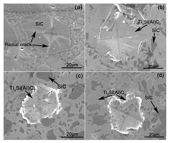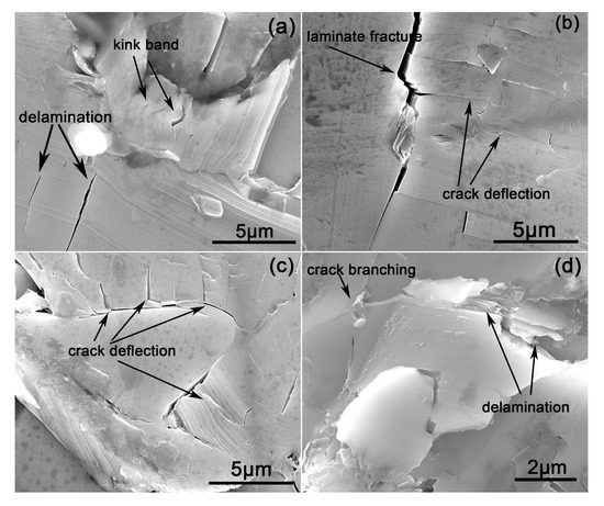 The relationship between the microstructure and the toughening mechanism of the reaction layers on the fabricated composites was further clarified from the crack propagation paths in the typical phase obtained using the indentation method (Figure 7). Figure 8 shows the energy-absorbing mechanisms of Ti3Si(Al)C2 shown in Figure 7. Figure 7a–d show the indentation micrographs of the polished surfaces of the composites infiltrated by the Al–Si–xTi alloy (Si: 10 wt.%) (x = 0, 5, 10, and 15 wt.%); the experiment was carried out at a load of 4.9 N. The areas affected by the indentation in the composites infiltrated by the Al–Si alloy (Si: 10 wt.%) (Figure 7a) were obviously large, and the cracks propagated diagonally along the ends of the indentation to a large extent. On the paths of crack propagation, the cracks passed directly through the SiC grain, leading to four radial cracks. On the other hand, the damage areas of the composites infiltrated by the alloys containing Ti (Figure 7b–d) were confined to the vicinity of the indentation, and the crack propagation from the corners was limited. The mechanisms of energy absorption of Ti3Si(Al)C2 (from Figure 7b–d) can be clearly observed in the higher-magnification SEM micrographs shown in Figure 8. The delamination and kink-band formation can be observed in Figure 8a. The laminate fracture and crack deflection can be observed in Figure 8b,c. Crack branching and delamination can be observed on the fracture surfaces shown in Figure 8d. The paths of crack propagation consume the fracture energy, which is beneficial to the improvement of the surface fracture toughness and strength of the composites. This suggests a high resistance to damage and correspondingly high toughness of the composites containing Ti3Si(Al)C2. Moreover, the resistance to crack propagation in the composites infiltrated by the alloys containing Ti increased with the increase in the Ti content because of the formation of relatively higher content Ti3Si(Al)C2 near the surface.