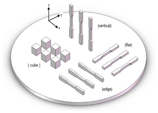Computer-aided design (CAD) models of cubes and three orthogonal orientations (flat, edge and vertical) tensile samples on the stainless steel substrate.