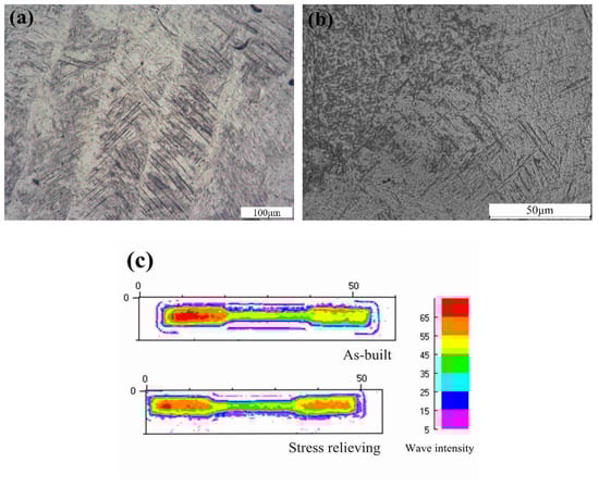 Optical microscopy in top surface: (a) the as-built sample; (b) middle portion of the stress relieving sample and (c) the echo amplitude diagram.
