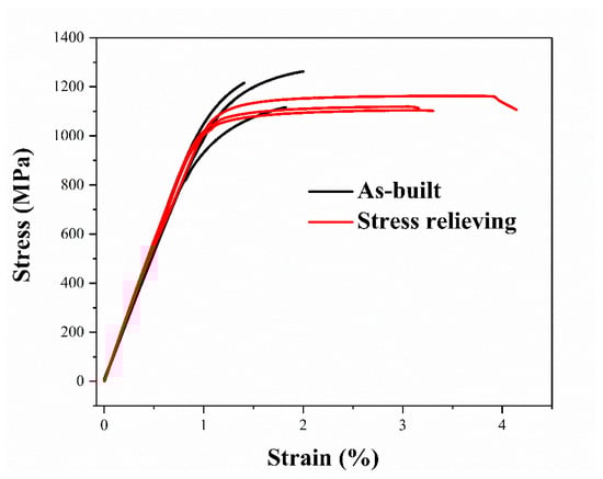 The performance of three different building orientation samples have been discussed in detail [20]; thus, two batches with six edge oriented samples were selected to study the mechanical properties in as-built and stress-relieved parts by tensile experiment. The stress-strain curve was shown in Figure 7. Additionally, the elastic modulus (E), YS, UTS, fracture stress (FS), fracture elongation (ε fracture) and hardness (H) were also analyzed, as shown in Table 4. The hardness (H) of both samples were in agreement with other reports [20,37].