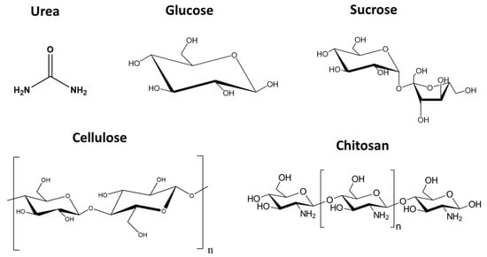 The carbon source strongly affects the texture of the carbon matrix, the composition of the final material but also its surface area and porosity. Specific synthetic details are reported in Table 1, while Figure 1 reports the chemical structure of the several carbon sources used.