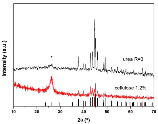 PXRD patterns of samples prepared using urea (R = 3, upper pattern) and cellulose (1.2% downer pattern). The expected pattern from the database for pure Fe3C and Fe0 are reported as vertical lines for comparison (Fe3C, black lines, ICDD: 03-065-2413 and Fe0 red lines, ICDD: 01-087-0721. Marked peak (*) is attributed to carbon (ICDD 01-077-7164).