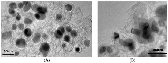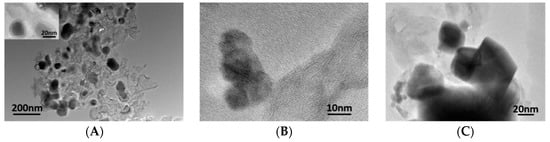 TEM investigation revealed, for both ratios (R = 8 and 16), the formation of medium-sized nanoparticles (20–60 nm on average), mostly agglomerated and ill-shaped, dispersed in the carbon matrix. As expected from the PXRD pattern (see Figure 4), for R = 16, nanoparticles are slightly smaller than for R = 8, but the presence of bigger and ill-shaped aggregates can be also seen (see Figure 5). Interestingly, the lower degree of crystallization for the carbon phase in R = 16 seems to also affect the nanoparticles’ morphology, possibly due to a lack of ‘protection’. In fact, for R = 8, a graphitic carbon shell around the particles was observed, which might act as a protective coating (see inset Figure 5A).