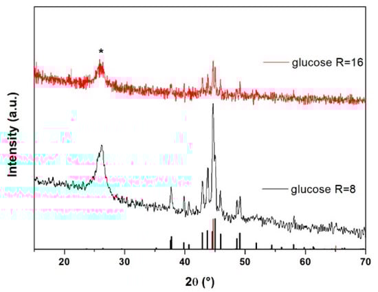 A similar trend to the cellulose-derived samples was observed when glucose was used as carbon source. Also in this case, both iron carbide and carbon peaks are observed (Figure 4). From Figure 4, it can be seen that for higher R, the carbon peak is less intense and broader while, for lower urea/metal ratio (R), residual Fe0 is observed.