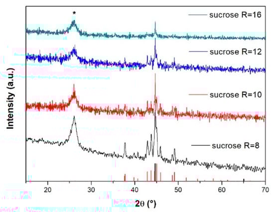 PXRD pattern of samples prepared with sucrose at different molar ratios (R). The expected pattern from the database for pure Fe3C and Fe0 are also reported as vertical lines for comparison (Fe3C, red lines, ICDD: 03-065-2413, and Fe0 black lines, ICDD: 01-087-0721. The marked peak (*) is attributed to carbon (ICDD 01-077-7164).