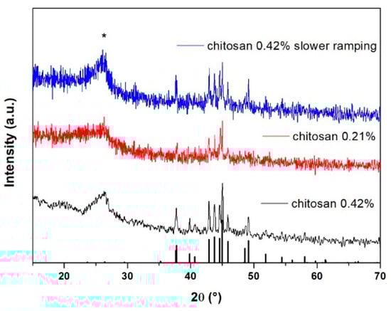 As expected, all samples prepared with chitosan form pure Fe3C, and no Fe0 was observed, although the chitosan/iron molar ratio had no influence on the final composition of the sample, as well as the heating rate. PXRD patterns of the chitosan samples are reported in Figure 8.
