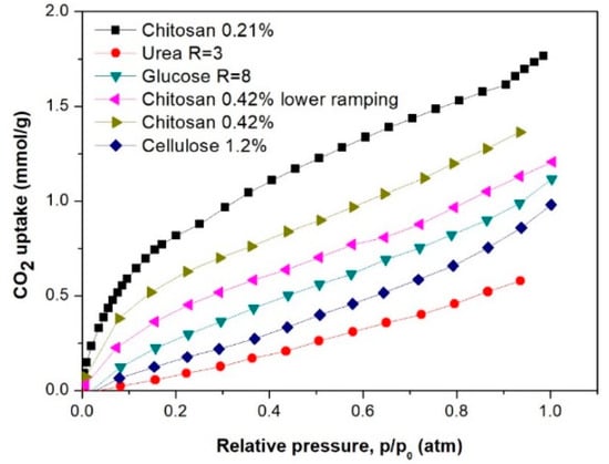 Figure 10 shows that chitosan samples possess higher adsorption ability for CO2. From the comparison of chitosan-derived samples with different chitosan amount, we can safely say that the better adsorbance is not just a question of surface area, with chitosan 0.42% samples having a higher surface area than chitosan 0.21%.