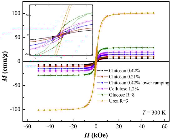 To observe whether the carbon source has an influence on the magnetic behavior of the as-prepared samples, magnetometry measurements were performed at 300 K, and the results reported in Figure 11 and Table S1. Different magnetization behaviors are observed for samples prepared with varying carbon source, as well as metal/C-source ratio which, in turn, means that the different materials have the potential to be used in a range of different applications. The magnetization of all the samples studied was saturated in applied fields above ~10 kOe. The saturation magnetization, σM, varies from 6 emu/g for chitosan 0.42% up to 100 emu/g for urea R = 3 sample. All samples exhibit some magnetic hysteresis (see inset of Figure 11 and Table S1) with coercive fields ranging from 87 up to 400 Oe.