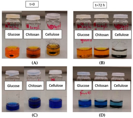 The solutions initially tested were 50 mg/L both for MO and MB and, after 72 h, a clear solution was obtained for cellulose sample in the case of MO, with a decrease in colour also for MB; such distinct differences were not observed for the other samples tested. The pictures are reported in Figure 12. Fe3C synthesized from cellulose was then believed to be the most promising candidate for dye removal from water.