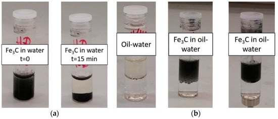 Vegetable oil was also tested as a real example of water contamination since it is commonly poured into the sink when used for cooking. Firstly, the sample was mixed with water and the powder almost immediately deposited on the bottom of the vial, with the addition of the oil, and the Fe3C sample (from cellulose) moved to the hydrophobic phase. When a magnet was moved close to the water phase, no oil mixed with it. The test with oil is reported in Figure 13. This material could then be applied for contaminants in wastewater, such as cooking oil, since it leaves the water ‘clean’.