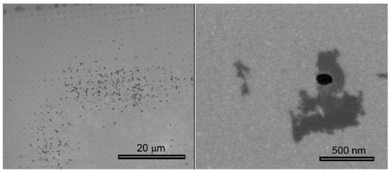 The combination of ζ and conductivity found using B-1 as buffer (−37.57 ± 0.46 mV; 0.48 mS cm−1) enabled a reproducible and ordered deposition of thin flakes over the hole array (Figure 4).