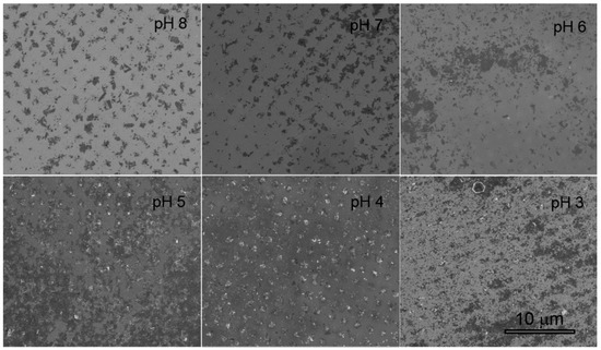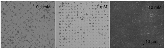 The reason for this unsatisfactory result was probably related to the low conductivity of the sample (0.001 mS cm−1) due to which high voltage (25 V, 5 min) were required for the deposition despite the highly negative ζ (−46.87 ± 0.71 mV) of WS2 flakes suspended in DI water. It was therefore concluded that ζ of the suspended flakes should be considered along with the conductivity of the sample in defining the best conditions for an efficient EPD. In order to improve the kinetics of deposition, DI water was replaced with aqueous solution of different salts (MES, PBS, and B-1) at different concentration and pHs. Figure 2, Figure 3 and Figure 4 illustrate the results obtained with MES, PBS, and B-1 by applying a significantly lower voltage equal to 3 V for 5 min, compared with the 25 V required by the experiment in water. It is important to note that with this low potential it was not possible to achieve an EPD in DI water.