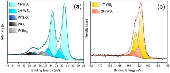 Table 3 reports the composition of the pristine WS2 nanosheets dispersed in DI water in detail. Whereas Figure 6 shows the chemical composition of the the WS2 nanosheets as a consequence of the dispersion into the media utilized in EPD process, as deduced by the multipeak analysis of the W 4f core levels (detailed XPS spectra and analyses are reported in Figures S1–S10 and Tables S1–S10 (Supplementary Materials)).