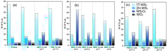 Comparing the material after the interaction with different media (Figure 6a), it can be seen that the solvent B-1 better preserves the properties of the pristine material. Actually, the sample shows only a very slight oxidation of the 1T phase to W(V), probably as a consequence of the hydrolysis of W-S bonds by hydroxyl ions. Among the tested MES samples (Figure 6b), the one at neutral pH maintains most of the pristine structure, even if a more marked oxidation was observed compared to B-1. The conversion was observed equally for the 2H and 1T phases, which were mainly converted to W(V). PBS 10 mM at pH 7.4, compared to MES, was preserved in a better way the 1T phase, but it is more prone to oxidize to W (VI).