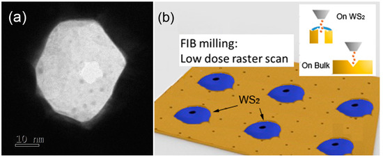 (a) TEM micrograph of the nanopore prepared into the 2D layer; (b) schematic illustration of the FIB milling over the array.