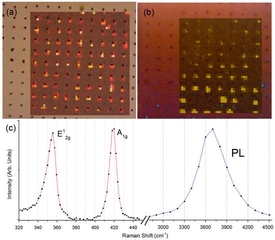 (a) Raman Map, integrated on the A1g mode at 410 cm−1; (b) PL map—excitation at 532 nm—emission integrated between 3000 and 4000 cm−1; (c) Example of collected spectrum.