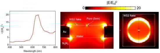 Computer simulations (see Methods for details) can be used to better evaluate potential enhancement effects. In particular, we considered a gold nanohole covered with a single layer WS2 flake. Into the 2D layer we designed a pore with a radius of 5 nm. Figure 9 illustrates the obtained field intensity confinement/enhancement that can be achieved. As noticible, the electromagnetic field intensity is highly confined inside the nanohole thanks to the high refractive index of the WS2. This, as illustrated in our Raman and photoluminesce experiments, enables enhanced light–matter interaction.