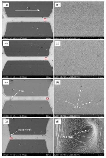 - Hauder, M.; Gstöttner, J.; Hansch, W.; Schmitt-Landsiedel, D. Scaling properties and electromigration resistance of sputtered Ag metallization lines. Appl. Phys. Lett. 2001, 78, 838–840. [Google Scholar] [CrossRef]