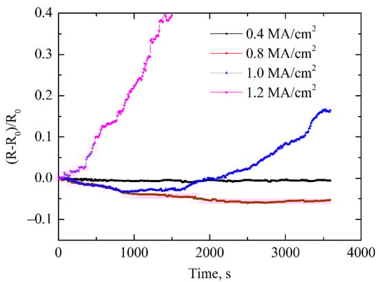 | Samples | Current Density (MA/cm2) | Current Supply Time (h) | Resistance Change | Surface Morphology |