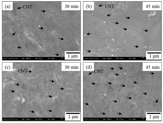 Figure 6 shows the FESEM micrographs of CNTs dispersed in the surface of the milled Al. It can be seen that CNTs are adhered and well dispersed on the surface of milled Al with the rotation speed of 100 rpm at different milling times are (Figure 6a) 30 min. and (Figure 6b) 45 min. After milling with the rotation speed of (in Figure 6c,d) 200 rpm, the nanotubes are strongly attached and uniformly embedded in the Al surface or underlying CNTs under the mechanical force of milling balls.