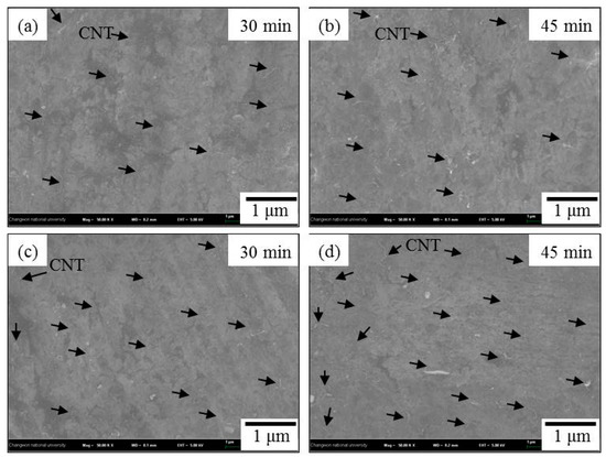 FESEM micrographs (×50,000) of milled Al with CNT at (a,b) 100 rpm and (c,d) 200 rpm for various milling times with 30 min and 45 min. (black arrows indicate the CNTs).