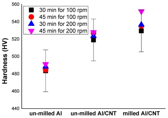 The hardness of fabricated samples found that the hardness of the milled Al with CNTs was dramatically improved when compared to un-milled Al with CNTs under the same experimental conditions.