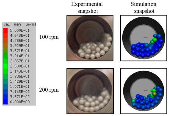 Figure 8 shows a comparison between the results of observing the actual ball motion, which takes a camera and the results of analyzing the ball movement by simulation according to different rotation speeds are 100 rpm and 200 rpm while using the zirconia ball. The actual and simulated results show a similar trend between the experimental and simulated movements.