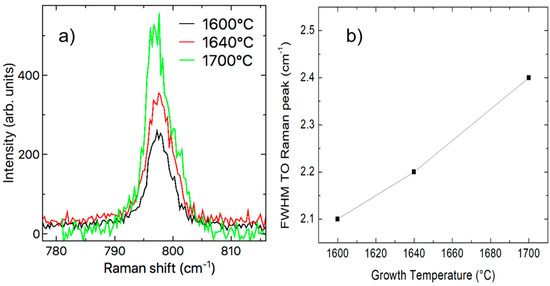 In the 3C-SiC, the micro-Raman signal of the transversal optical (TO) mode in our experimental conditions (back scattering configuration and (001) oriented samples) should be forbidden [12] due to selection rules. In the “perfect” cubic structure (001)-oriented, the TO Raman peak is not allowed, for this reason, the TO peak could be considered as a marker of the quality of the material. Nevertheless, the defects and stress produce a loss of periodicity, reduction of crystal symmetry, and topological disorder of crystals. Therefore, they induce a breakdown of the selection rules and the appearance of such a peak in the experimental spectra. Figure 3 shows the TO intensity peak for samples grown at different growth temperatures. The decreasing signal intensity means a decreasing of crystal “disorder”. Lower intensity was recorded for samples grown at 1600 °C. Moreover, the FWHM of the TO mode is related to the crystal quality of the film. In Figure 3b the FWHM of the TO mode (reported in Figure 3a) as a function of growth temperature is reported. The graph clearly shows that the quality of the material improves when lowering the growth temperature. These results confirm the XRD result reported in Figure 2.