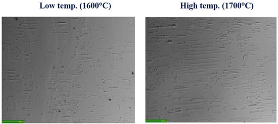The Stacking Faults (SFs) density on the surface was investigated by etching epilayer in molten KOH and observed by a fully automated optical microscope. Image analysis software allows to count and classify SFs. Figure 4 shows the optical microscope image of the sample growth at 1600 °C (left) and 1700 °C (right). The figure shows the shape of the stacking faults after the etching (line-like). By comparing the figures, we can observe that the total amount of SFs is lower for the low-temperature sample and the low temperature also shows the lower SFs length. At high temperatures, the number of short SFs decreased and, at the same time, the SFs became longer. The increased amount of SFs at high growth temperatures is the reason why both the XRD and micro-Raman defect evaluation analysis shows better crystal quality at lower temperatures.