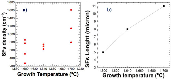 In Figure 5, the results of the SFs analysis, based on the previous images, on the 3C-SiC film as a function of deposition temperature, are reported. From the SFs data analysis, an increase of both the SF density (see Figure 5a) and SF length (see Figure 5b) was observed with increasing temperature.